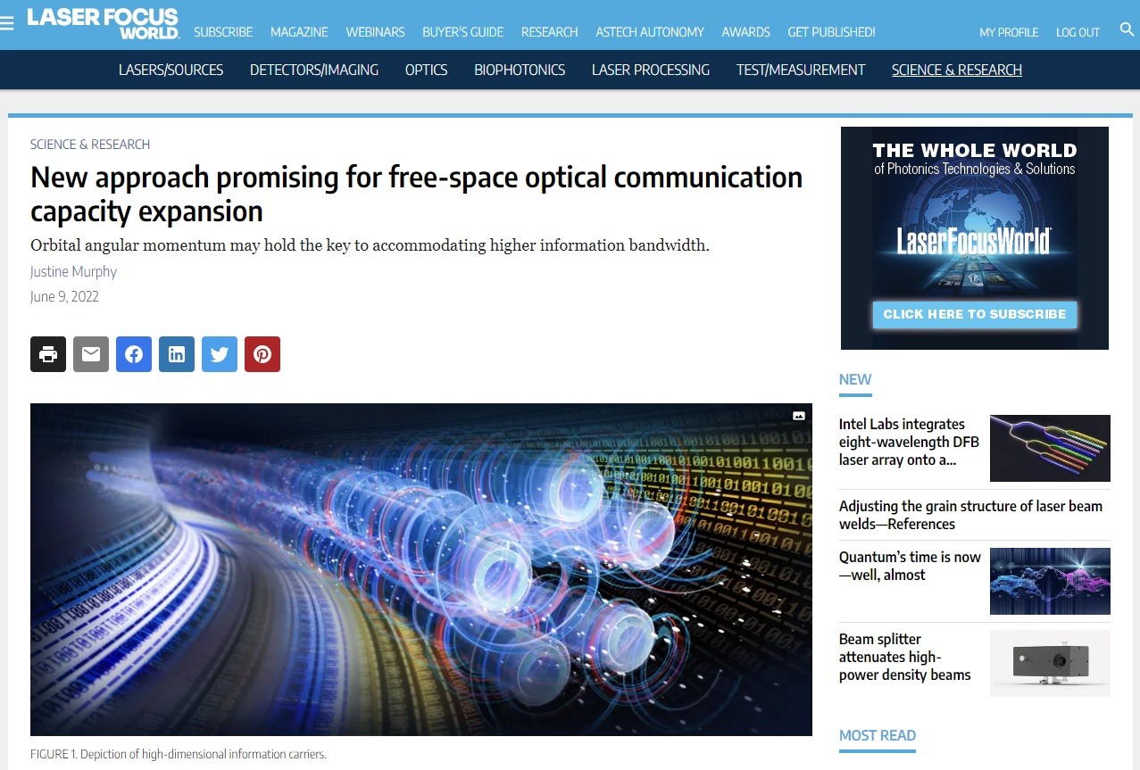 高维涡旋光突破通信限制,被《麻省理工科技评论》封面报道,入选ESI热点、高被引论文