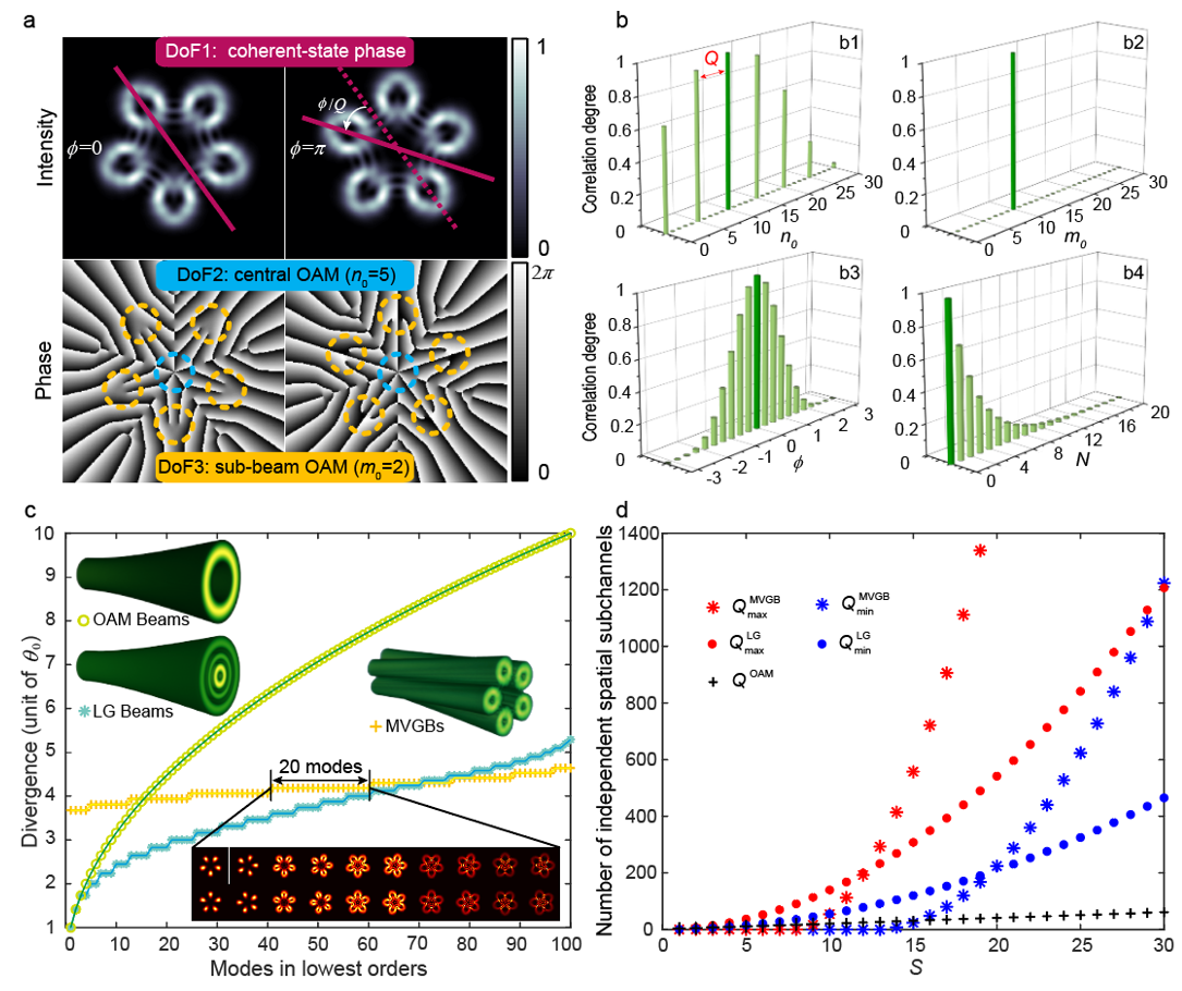 携带光学轨道角动量的涡旋光理论上能够提供无限多的正交信息通道,从而支撑无限大的数据量,为下一代(6G)通信技术革命提供了极大的想象空间。然而实际演示系统中,涡旋通道数往往被限制在20个以内,因为传统涡旋光的发散角随着阶数增加而迅速上升,使得所需接收口径急剧扩大,严重限制了其应用潜力。