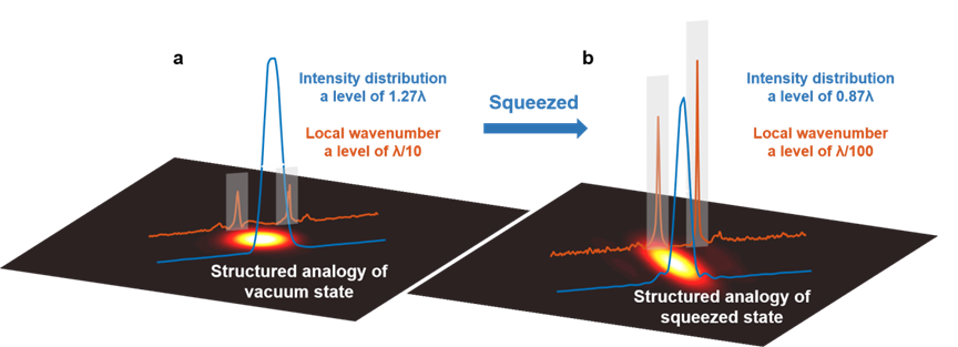 紧聚焦条件下,经典压缩态结构光的光斑半峰全宽可由1.27λ压缩至0.87λ,接近光学衍射极限;其局域波矢的半峰全宽可由λ/10量级压缩至λ/100量级(λ为波长),大幅超越光学衍射极限,为精密测量与超分辨成像等应用提供了突破性工具。