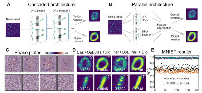 该工作利用散射介质中光的复杂传播形成的散斑图案,作为光电神经网络的噪声源,同时结合衍射光学神经网络对大规模空间模式的高效并行处理,成功实现了图像生成任务中噪声采样与网络计算的光学平台一体化。此外,利用散射介质的记忆效应,通过扫描照射位置,实现了不同类别图像间的平滑过渡。