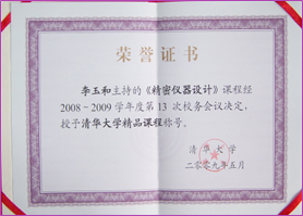(1)“精密仪器设计”课程负责人, 2009年获“清华大学精品课”, 2012年获北京市教学成果二等奖;(2)主编教材《现代精密仪器设计》, “北京高等教育精品教材”、“十一五”国家级规划教材, 被北京航空航天大学、山东科技大学等多所高校选用, 2012年获“中国机械工业科技进步三等奖”;
