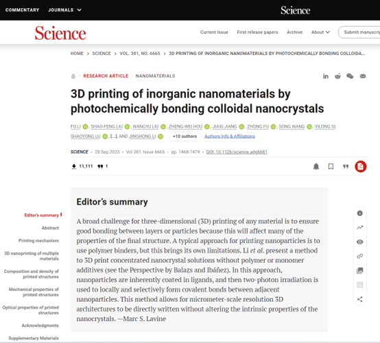 Science | 3D printing of inorganic nanomaterials by photochemically bonding colloidal nanocrystals