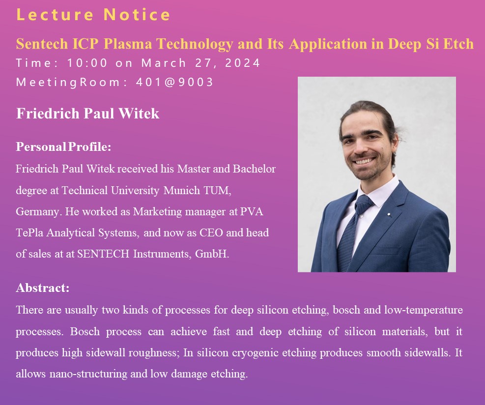 Lecture Notice|Sentech ICP Plasma Technology and Its Application in Deep Si Etch