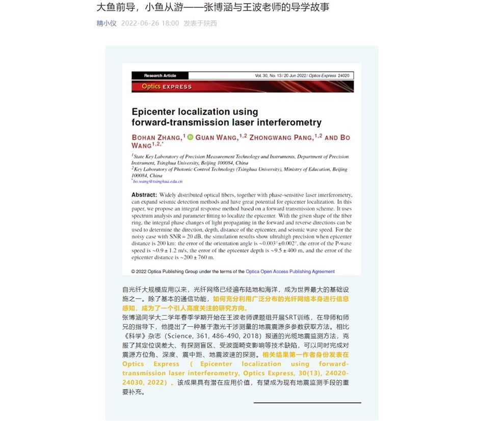 In the paper published in Optics Express, Bohan Zhang, an undergraduate who trained in SRT in our research group, proposed a multi-parameter seismic source acquisition method based on laser interferometry. Compared with the optical cable seismic monitoring method reported in Science (361, 486-490, 2018), this optical cable seismic monitoring method overcomes the technical defects such as large positioning error, detection blind area, affected by wave surface distortion, and can simultaneously complete the detection of the source azimuth, depth, epicenter distance and seismic wave velocity. The results are published in Optics Express (Epicenter localization using forward-transmission laser interferometry, Optics Express, 30(13), 24020-24030, 2022) as the first author. The result has potential application value and is expected to be an important supplement to the existing seismic monitoring methods.