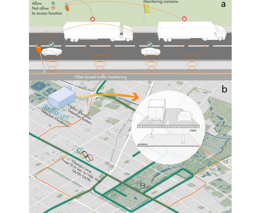 The existing traffic flow monitoring methods based on mobile phone navigation has been widely used. But limited to user bias, it cannot accurately show the traffic of large trucks. The research group used a fiber-based traffic sensing system to monitor the flow of heavy and light vehicles respectively, and verified its reliability by comparing with AutoNavi data. In addition, the analysis of the heavy vehicle flow during the 2022 Winter Olympics and the 2021 Double 11 finds interesting traffic phenomena. The paper entitled "Urban Fiber based Laser Interferometry for Traffic Monitoring and Analysis" was published and available:"Urban Fiber based Laser Interferometry for Traffic Monitoring and Analysis," Journal of Lightwave Technology, accepted, 2022.