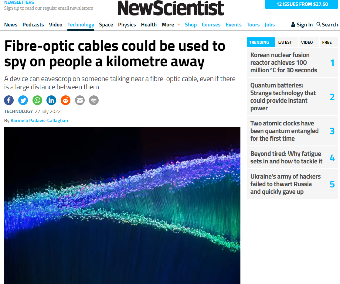 The work of the research group "Indoor optical fiber eavesdropping approach and its avoidance" has been widely reported