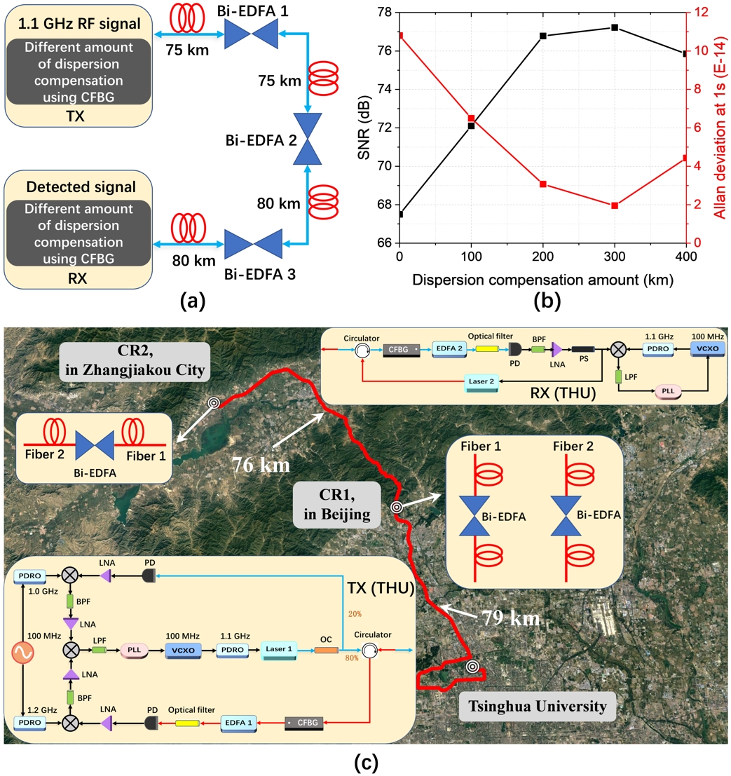 In the long-distance fiber-based frequency transmission, the traditional dispersion compensation method is dispersion compensating fiber, but there exist problems of high insertion loss, high latency and large footprint. Our research group propose a dispersion correction method based on chirped fiber Bragg grating (CFBG), which has the advantages of lower insertion loss, lower time delay and smaller size than using DCF. Based on the CFBG, the research group achieved high-precision dissemination of atomic clock signals on a 310-km urban optical fiber link from Tsinghua University to Zhangjiakou city, one of the host cities for the 2022 Beijing Winter Olympics. Furthermore, the CFBG-enhanced bidirectional erbium-doped fiber amplifier (Bi-EDFA) is proposed to optimize the dissemination performance and extend the frequency dissemination distance to 500km, which demonstrates the potential and applicability of the dispersion correction-based frequency dissemination system. The relevant word has been published in IEEE Transactions on Instrumentation and Measurement. (Yufeng Chen, Hongfei Dai, Hongwei Si, Fangmin Wang, Bo Wang*, and Lijun Wang. Long-haul High Precision Frequency Dissemination based on Dispersion Correction. IEEE Transactions on Instrumentation and Measurement, 71,5503207,2022.)