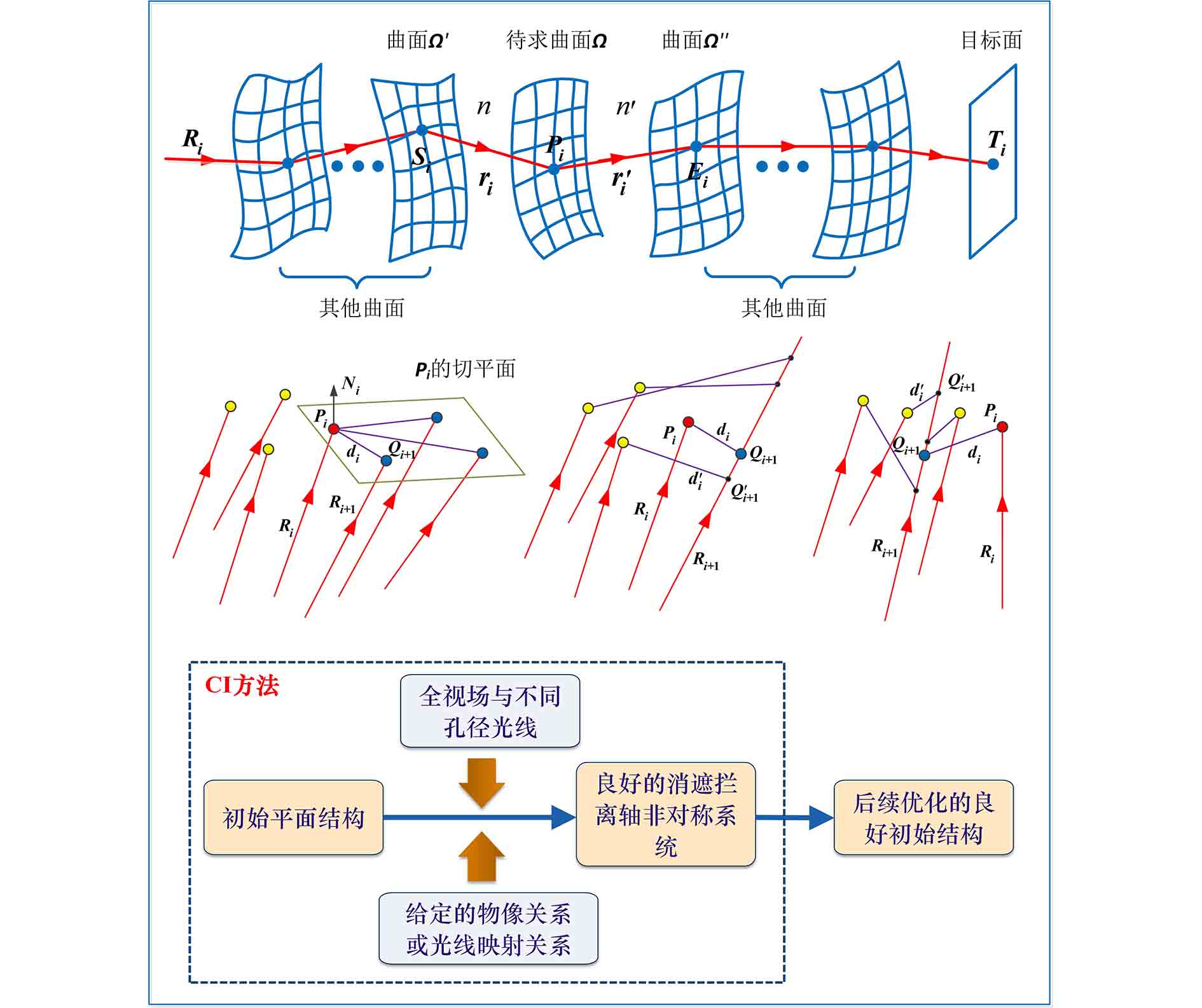 Traditional design method of freeform imaging systems is to find existing patents or other available systems as the starting point. Then, further optimization with optical design software is applied to obtain the final design result. However, as the freeform surfaces are generally used in the off-axis or unobscured forms, there are few existing patents or systems for choice. Moreover, the system configuration, the number of elements, and the system specifications (such as the field-of-view (FOV), the F-number and the focal length, etc.) of the existing systems are generally not consistent with the expect specifications of the current design. Therefore, designers may fail to find useful solutions, or they have to spend long times improving the starting point. Consequently, some direct design methods for freeform surfaces have been developed. In these methods, the points on the freeform surfaces are calculated and then the freeform surfaces are obtained through surface fitting. The systems generated by these methods can be taken as starting point for further optimization. However, these methods have a restriction on the number of field points considered in the design process (or sometimes a wide field-of-view but with a very small aperture considering only chief rays), which limit the applications of these design methods.